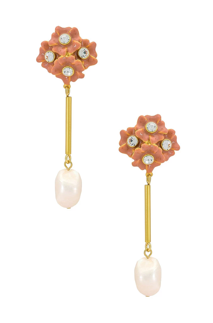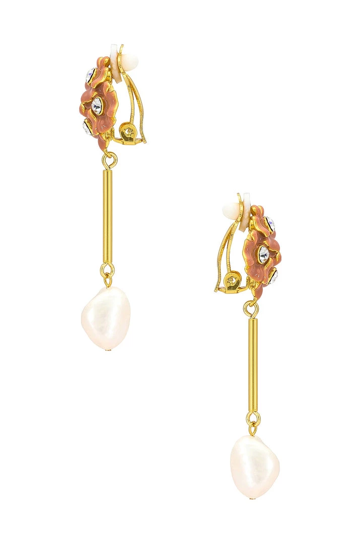 - Gold-plated brass with pearls, clear crystals, and enamel